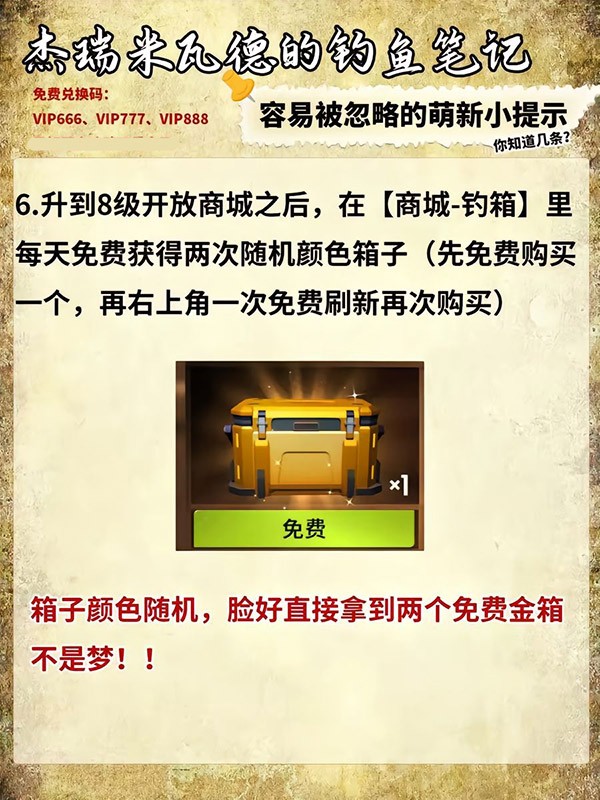 4、升到8级开放商城之后,在【商城-钓箱】里每天免费获得两次随机颜色箱子(先免费购买一个,再右上角一次免费刷新再次购买)