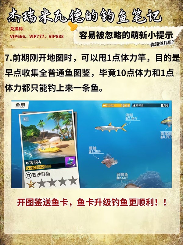 5、前期刚开地图时,可以甩1点体力竿,目的是早点收集全普通鱼图鉴,毕竟10点体力和1点体力都只能钓上来一条鱼;