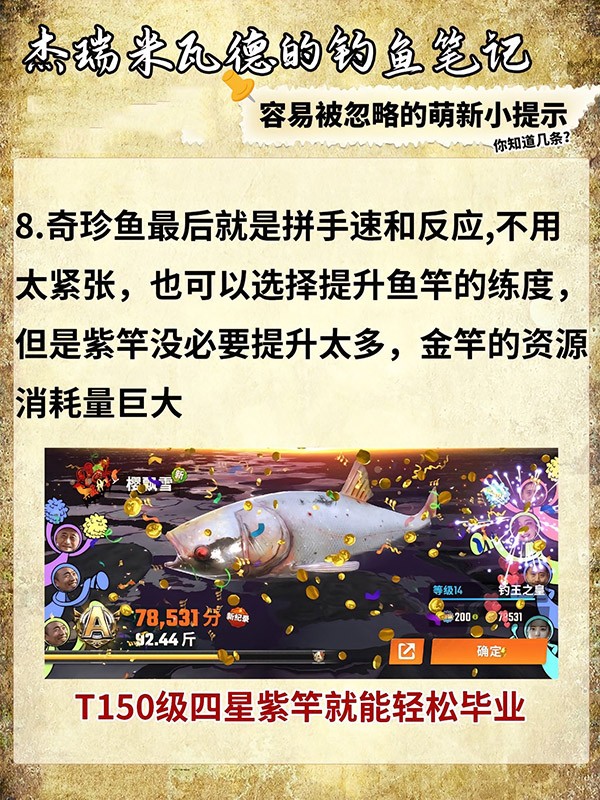 6、奇珍鱼最后就是拼手速和反应,不用太紧张,也可以选择提升鱼竿的练度,但是紫竿没必要提升太多,金竿的资源消耗量巨大。