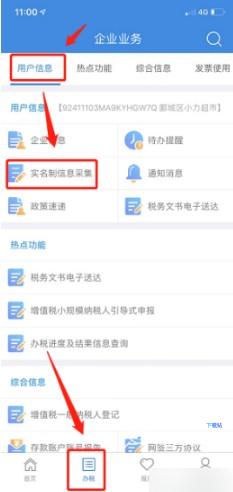 5、登录之后点击下方的“办税” - “用户信息” - “实名制信息采集”,进入实名制采集,选择列表中显示未认证的人员信息进行认证。