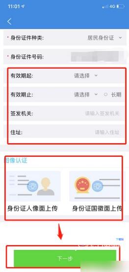 6、打开实名信息填写和上传界面,填写补充带星号的内容,并上传身份证正反面照片,点击下一步,进入人像采集界面,采集完成以后,点击提交等待审核即可。