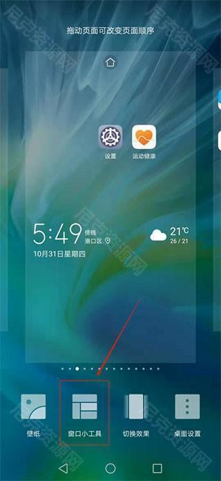 4、返回手机桌面,双指收拢呼出屏幕布局工具,点击【窗口小工具】。