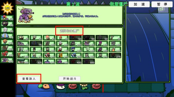 3、与常规玩法一致,玩家可以根据敌人的布阵选择僵尸进入;