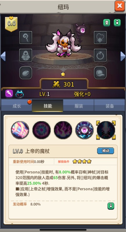 技能效果:使用[Persona]技能时,有8.00%概率召唤[神杖]对目标320范围内的敌人造成65伤害.另外,将[[纽玛]的爆击概率提高25.00%4秒. (应用[上帝之杖]增强效果,而不是[Persona]技能的增强效果.)