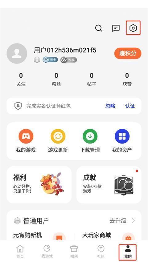 1、双击打开oppo游戏中心,点击右下角的我的,再点击右上角的齿轮按钮;
