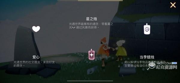 点击游戏界面的左上角可以看到我们拥有的蜡烛数量。从左到右依次是普通蜡烛、季节限定蜡烛、爱心。这3个是游戏中的货币。其他人赠送给自己蜡烛时,我们就可以获得爱心。