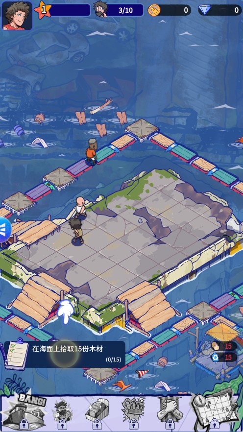 1、初始阶段资源少,第一目标就是收集漂浮资源,木板、绳索、金属、塑料。