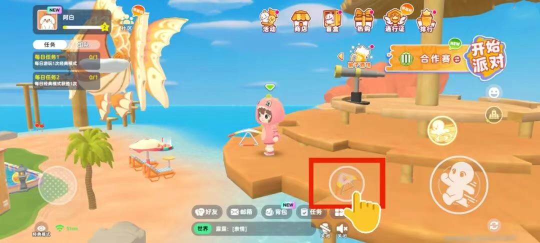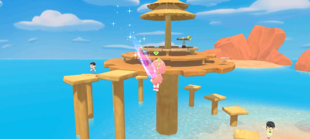 1、找到图中浪漫海岛上的观景台。(需要通过跳梅花桩到达顶部哦)