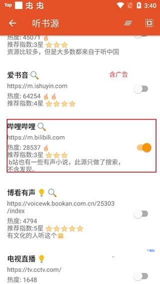 4、在众多的书源中,选择自己喜欢的并且启动,值得注意的是,有部分是含有广告的,可以自行选择是否需要开启;