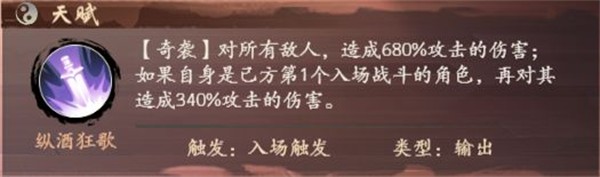 李酒仙作为奇袭侠客,入场即可触发“纵酒狂歌”天赋,对全场的所有敌人造成680%攻击的伤害,如若李酒仙为第一个手动下牌的侠客,还将造成第二段340%攻击的伤害。