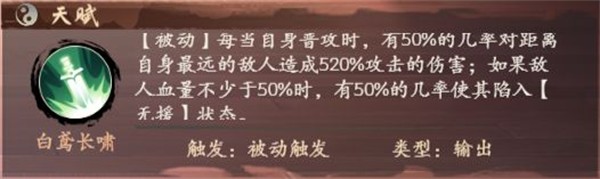 鸢姑娘作为被动输出侠客,每当在场上对敌人进行普通攻击时,将有50%的几率,使得距离自身最远的敌人造成520%攻击的伤害,若敌人血量不少于50%,将有50%的几率使敌人陷入“无援”状态(暂时阻止敌人触发天赋效果,持续两秒)