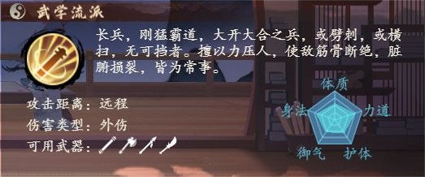 鸢绮梦为长兵武学流派侠客,可以使用棍、长枪、长刀、长斧等长兵流派武器。修习的功法也需要为长兵流派,鸢姑娘天赋异禀,勤学苦练,相信在各位掌门的培养下,鸢姑娘定会再给江湖一些震撼!