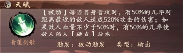 南宫诗剑作为被动输出型侠客,当他在场上舞出剑花,向敌方进行普通攻击时,将有50%的几率对最近的敌人进行攻击,如果敌方血量不少于50%,将有50%的几率使得敌人陷入【僵直】状态。想必是看到南宫诗剑的气势,吓得不敢动弹了吧!