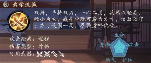 苏莱悦作为双持流派侠客,擅长使用双刀、双剑、双钩、双刺等双持兵器,修习的功法也需为双持流派功法。苏姑娘容貌姣好,在战场中常让人放下戒心,打出意想不到的反击效果,相信在掌门的培养下,苏姑娘的反击之势会更加迅猛难测!