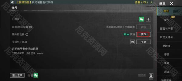 3、然后我们会来到账号设置页面,在其中有账号绑定、国家选择、服务器选择,在服务器右边可以选择更改;
