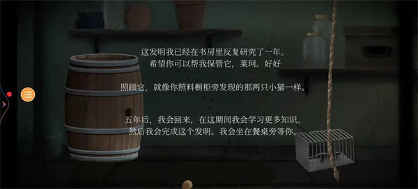 14、向左滑动,来到别墅,进入。玩家一:打开门,下滑下楼,点开酒塞,点击绳子,点击右侧玻璃罐后的壁虎,等它爬到左侧后,再次点击,直到壁虎进入笼子。至此三条信息全部出现。玩家二:花盆下纸条得知,需要按规律敲铃铛才能进入下面的场景。