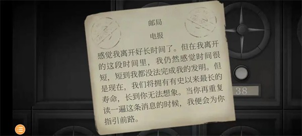 25、来到邮局。玩家一:看到电报机,一共十个密码,可以选择长和短。玩家二:根据上述线索,将指针指向南、东南、东北、东北,打开箱子,得到一份电报。