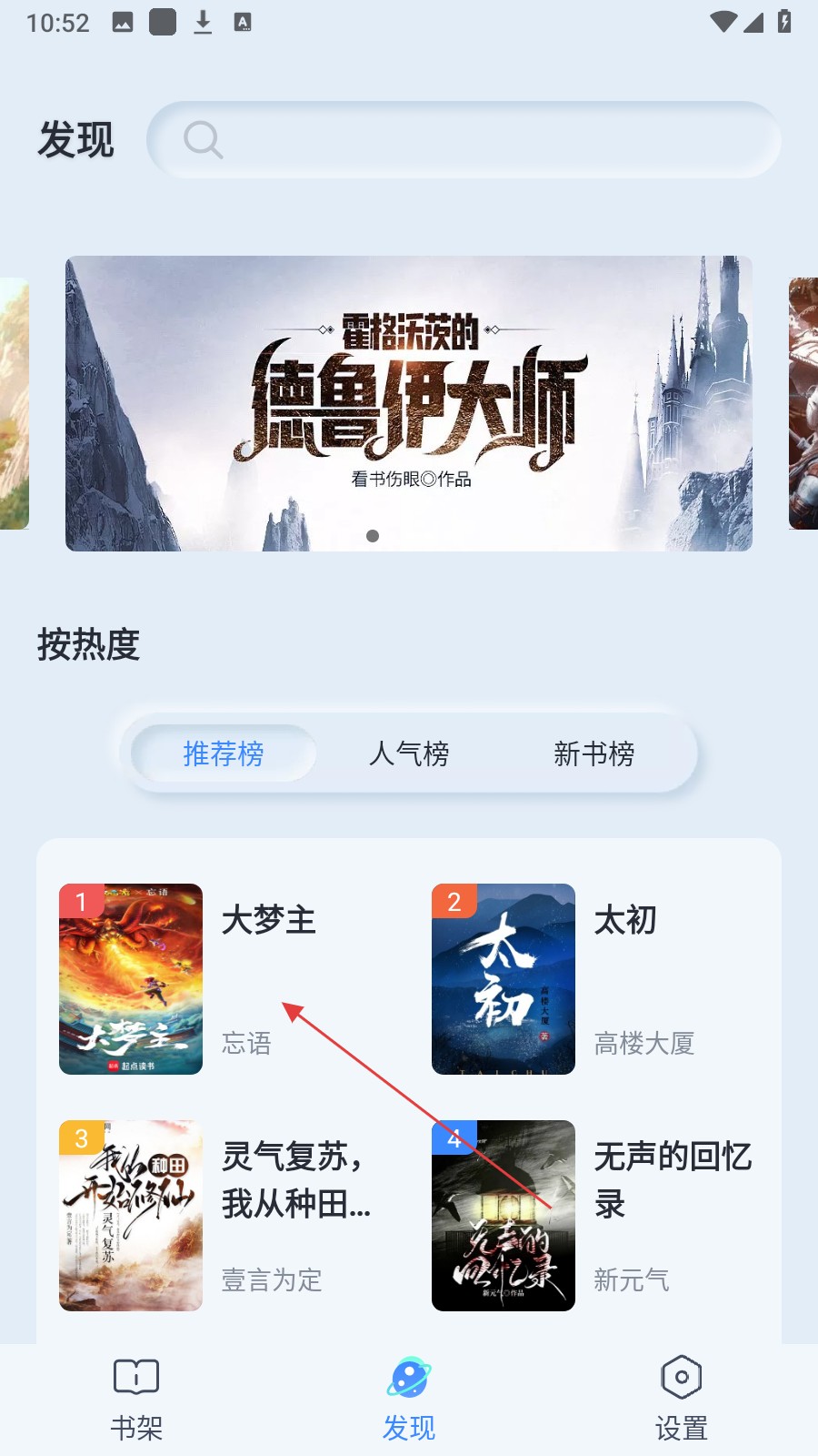 1、在发现页面,点击推荐榜里的【喜欢的书籍】,自动进入搜索结果页面。