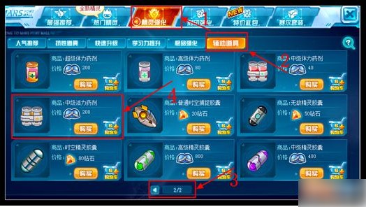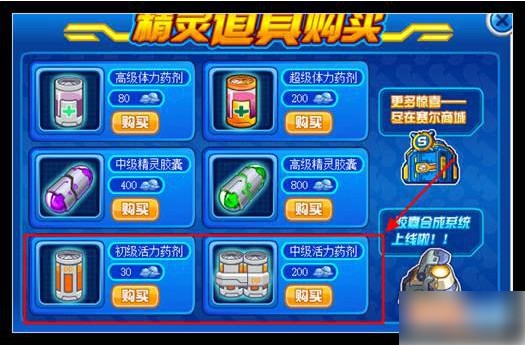 点击游戏右下角进入商城,在上方的商城分类中点击进入精灵强化-辅助道具,再点击商城下方翻页按钮至第二页,即可购买中级活力药剂啦,价格也是200赛尔豆哦。