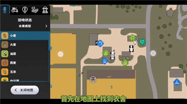 1、购买种子需要先找到地图,如下所示可以看到田地状态,水果类型之类的,农作物有小麦、大麦、油菜、燕麦、玉米、向日葵等,来到这里点击如下图所示的一个带有定位箭头标志的地方,定位即可把玩家送到房子旁边