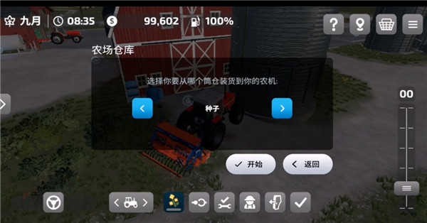 4、点击一下出现农场仓库,选择你要从哪个筒仓装货到你的农机,左右滑动选择种子,然后点击下面的√就可以购买种子了