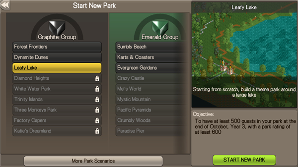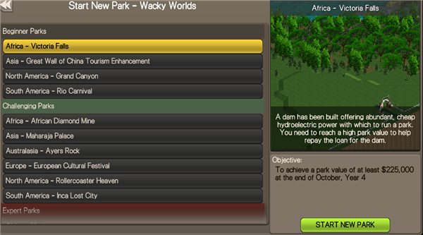 4、如果你想自己建造公园点击首页中的Start New Park,选择一个公园场景。
